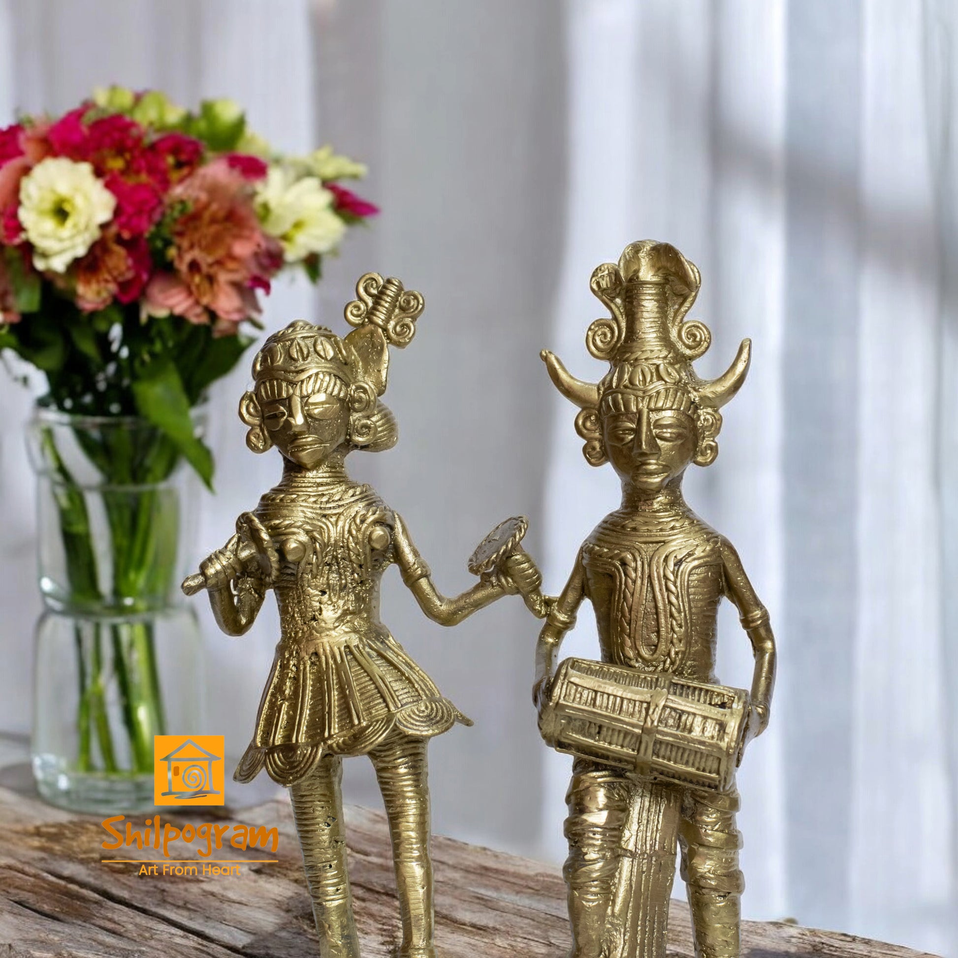 This exquisite Chhattisgarh Bastar Dhokra brass metal showpiece features a Maria tribal couple, showcasing traditional craftsmanship with intricate detailing. Handcrafted using the ancient lost-wax technique, it reflects the rich cultural heritage of Bastar artisans. Ideal for adding an authentic ethnic touch to your decor, this decorative piece combines artistic value with durable brass material, making it a timeless collectible for connoisseurs of tribal art.