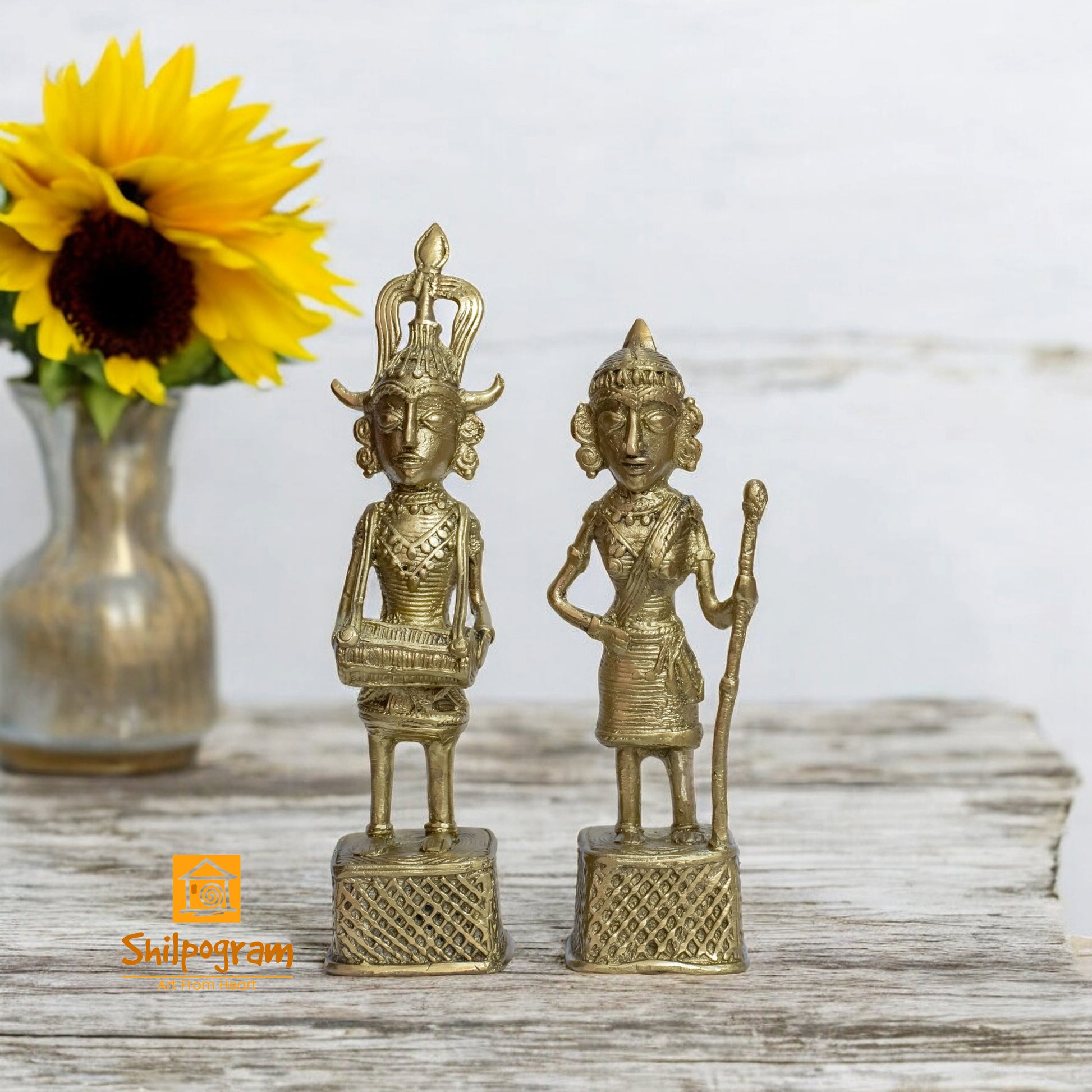 This exquisite Chhattisgarh Bastar Dhokra brass metal showpiece features a Maria tribal couple, showcasing traditional craftsmanship with intricate detailing. Handcrafted using the ancient lost-wax technique, it reflects the rich cultural heritage of Bastar artisans. Ideal for adding an authentic ethnic touch to your decor, this decorative piece combines artistic value with durable brass material, making it a timeless collectible for connoisseurs of tribal art.