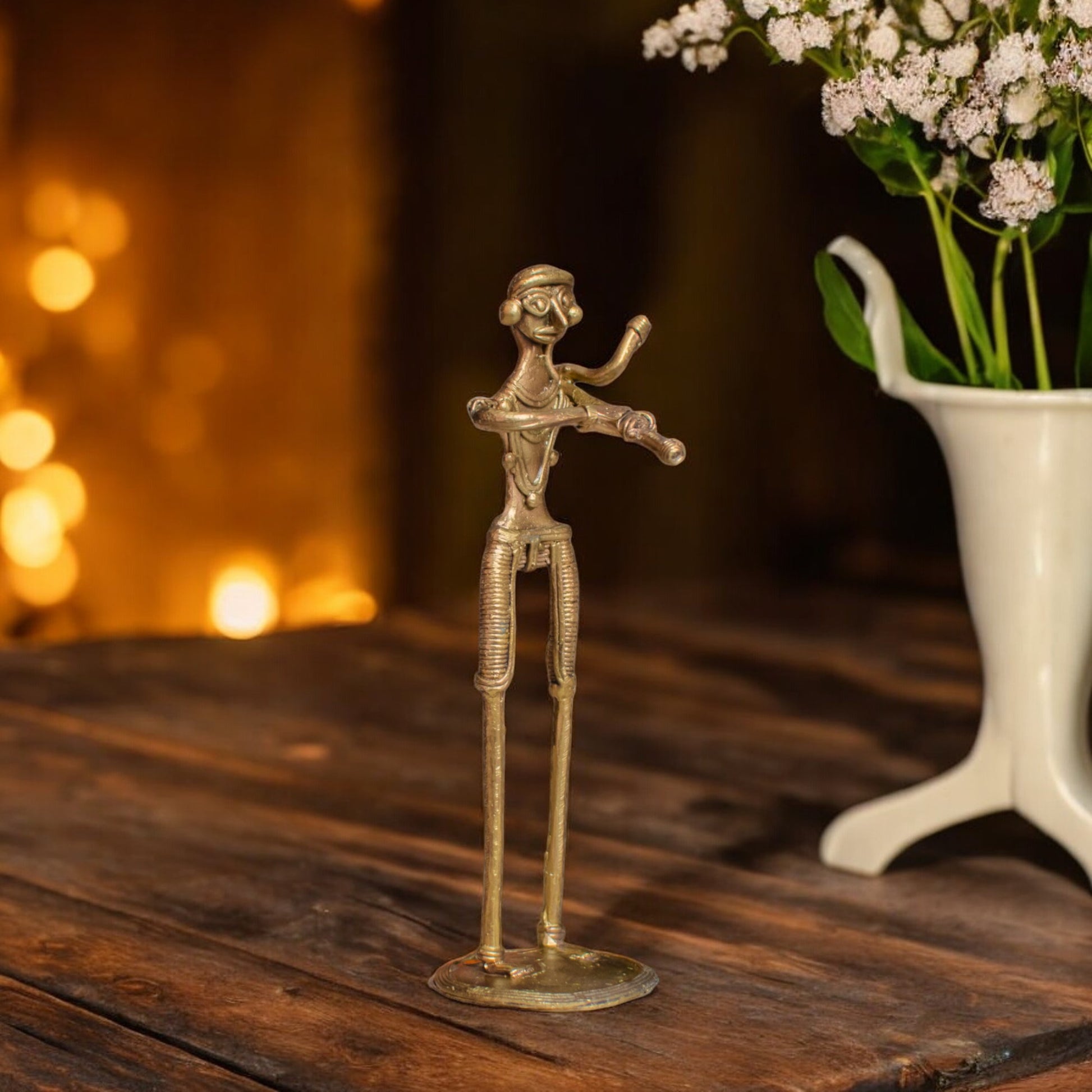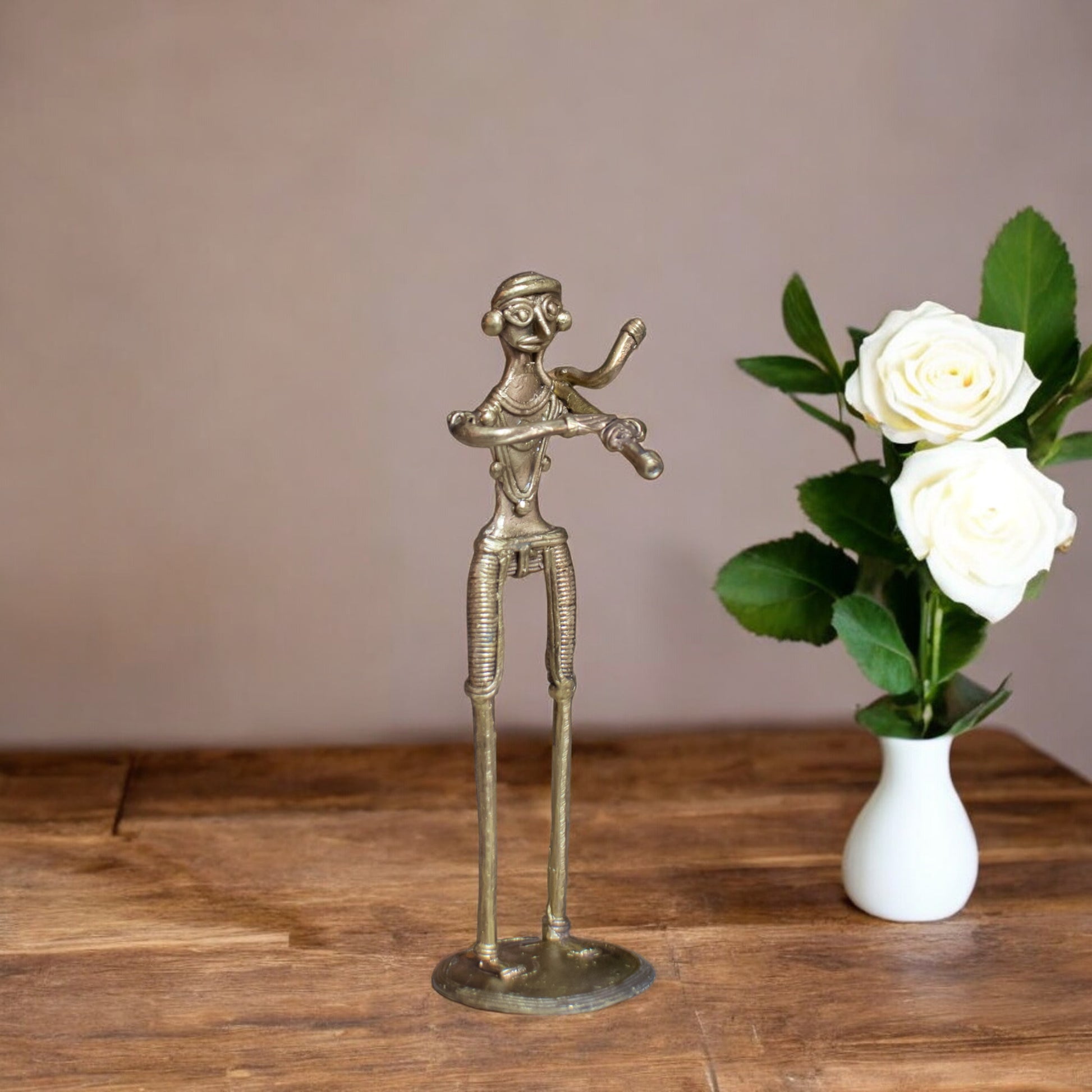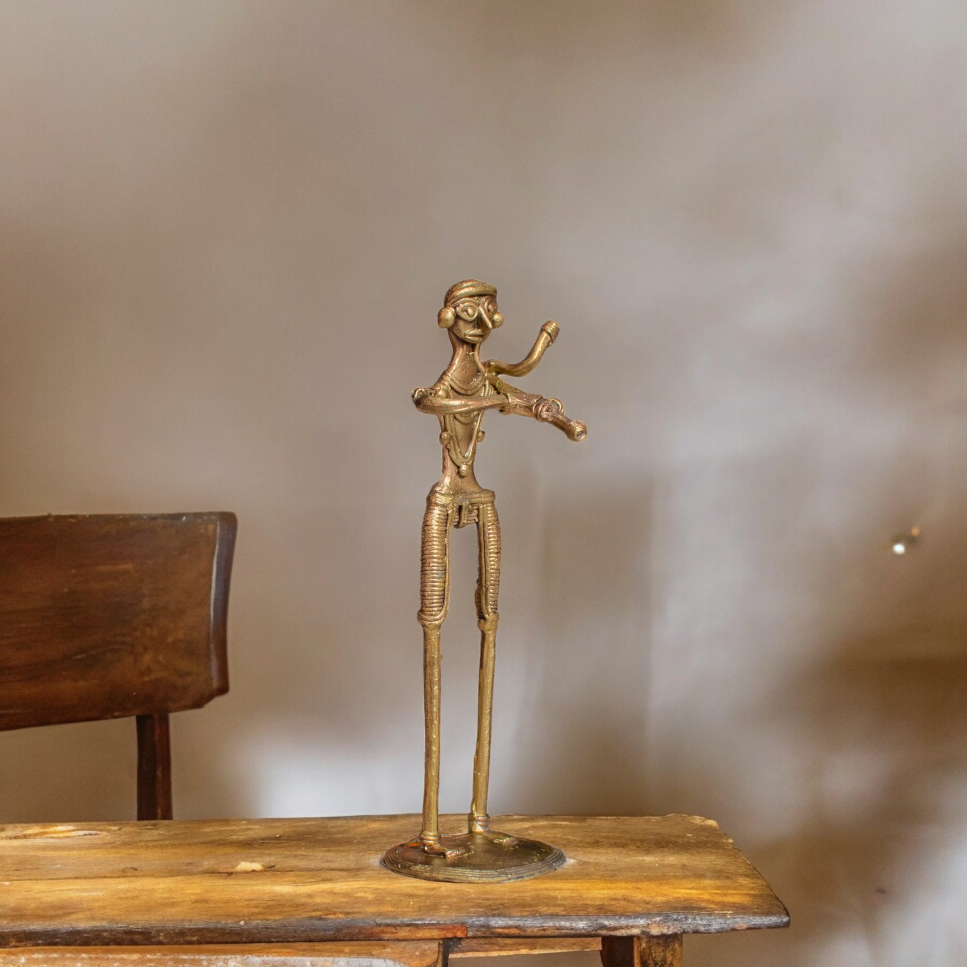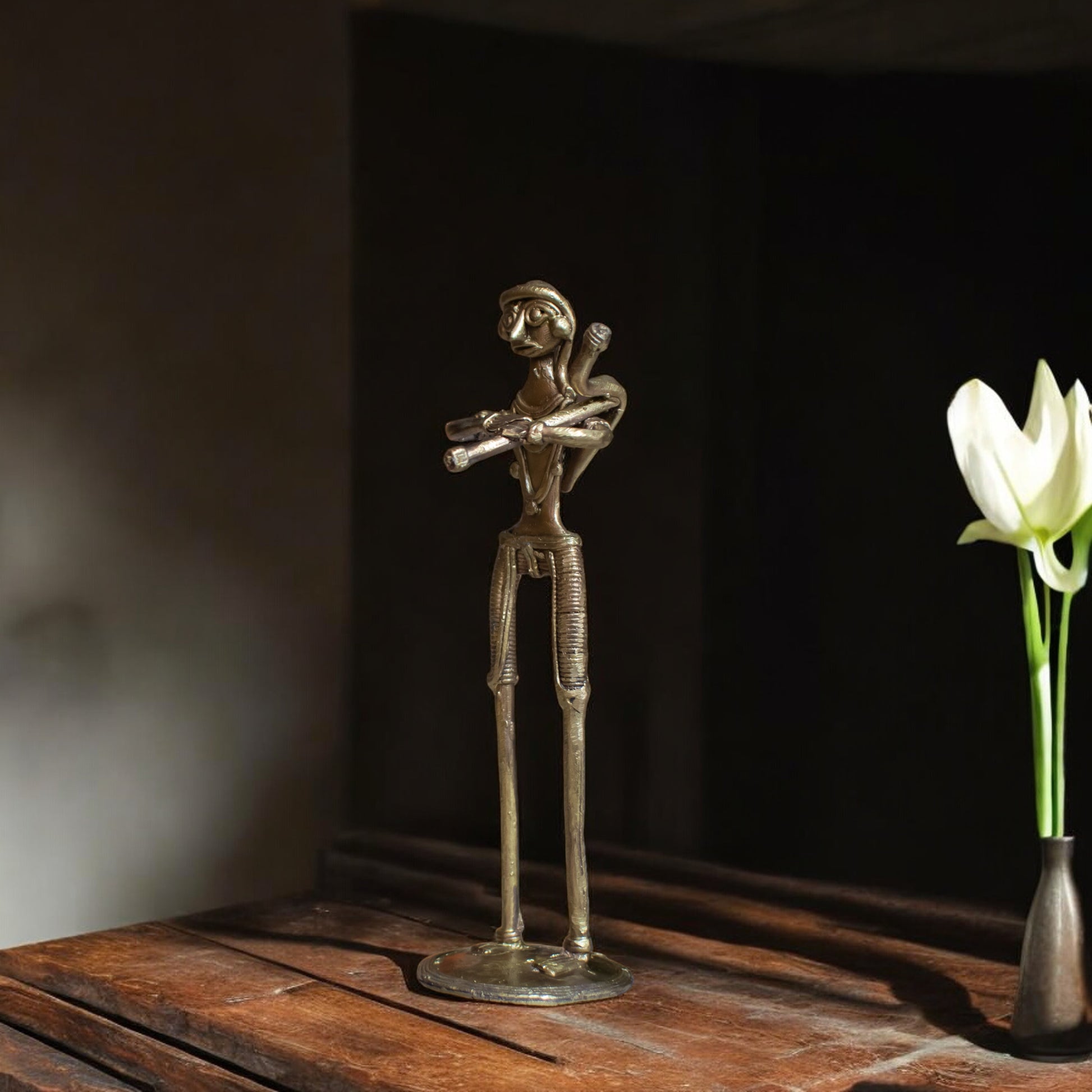 Elevate your home décor with this authentic Dhokra Art brass metal sculpture depicting a farmer carrying a plow on his shoulder. This meticulously crafted piece showcases the ancient lost-wax casting technique, featuring distinctive tribal motifs and textured detailing characteristic of traditional Indian craftsmanship. A sophisticated cultural statement that adds artistic depth to any interior space.