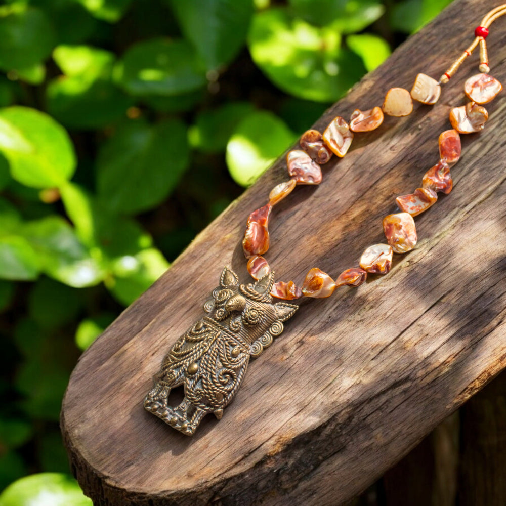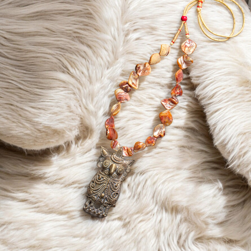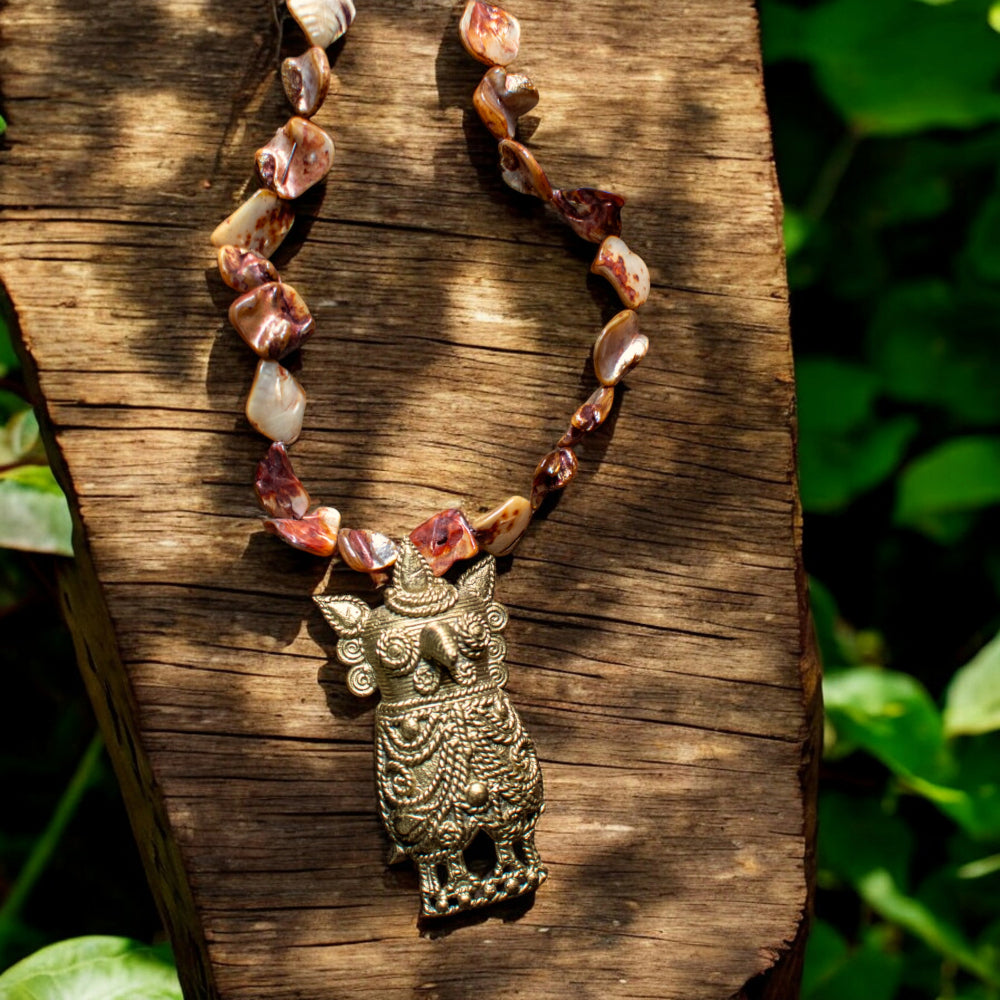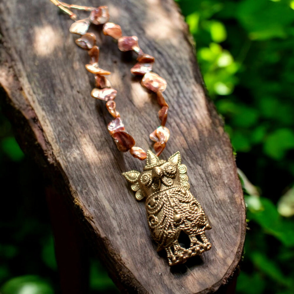 Experience the beauty and intricacy of Dhokra Art Brass Metal Jewellery. Each stunning piece features a unique owl design and handcrafted unshaped beads, making it truly one-of-a-kind. Enhance your style with the elegance and charm of these exquisite pieces, perfect for any woman's collection.