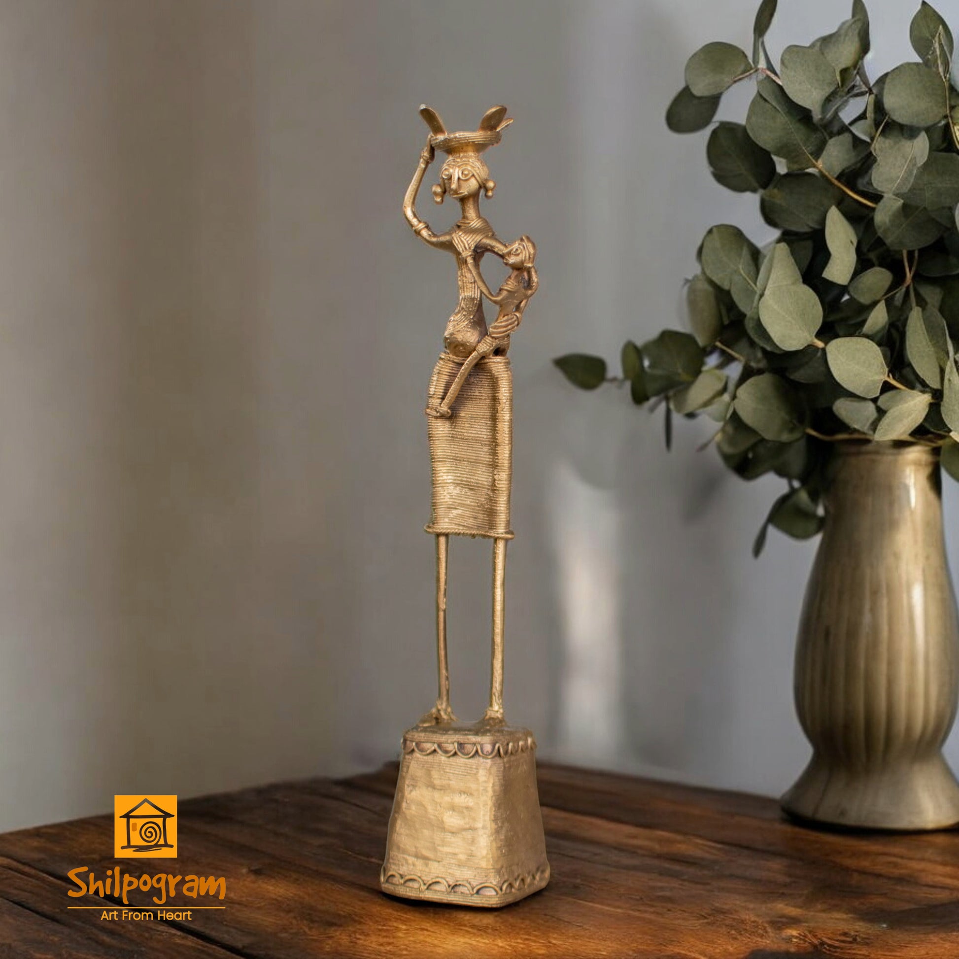 Exquisite Dhokra Art sculpture depicting a woman carrying both a baby and fish basket, showcasing the ancient lost-wax casting technique. This handcrafted brass metal figurine features intricate tribal motifs and distinctive primitive patterns, making it a sophisticated statement piece for collectors and interior designers. Each piece carries cultural significance while adding authentic artistic heritage to contemporary home décor.