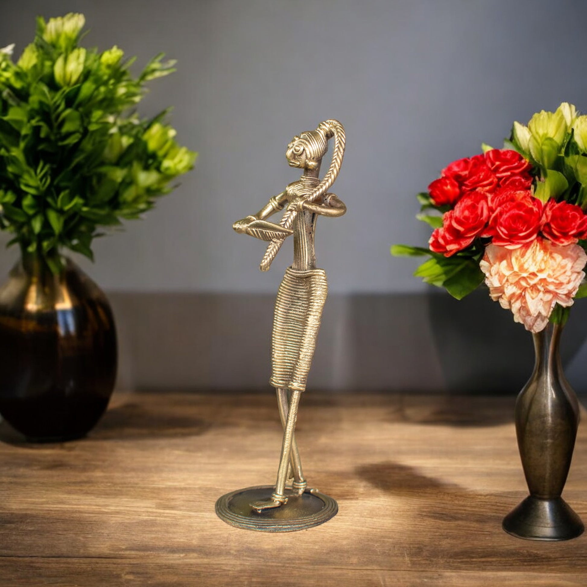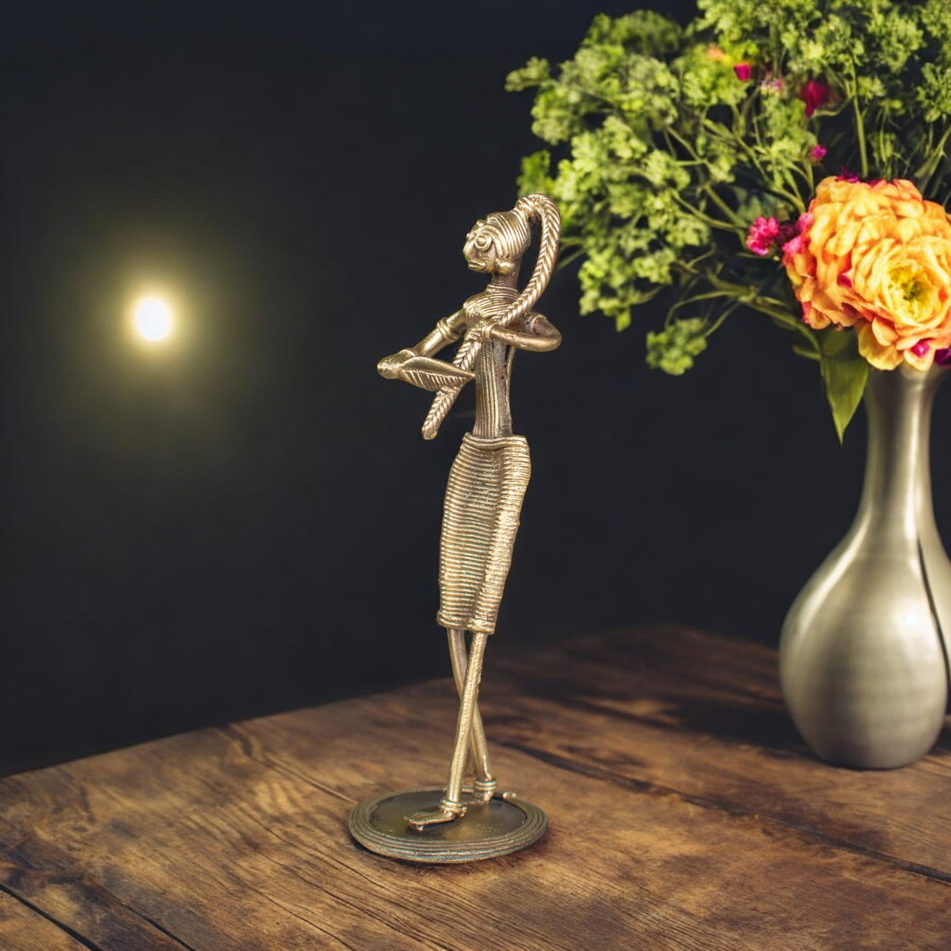 Elevate your home décor with this exquisite Dhokra Art piece featuring a woman combing her hair. Handcrafted using the ancient lost-wax casting technique, this brass metal sculpture showcases intricate detailing and authentic tribal artistry. Each piece carries the distinctive textured finish characteristic of traditional Dhokra craftsmanship, making it not just a decorative item but a cultural artifact that adds sophistication to any interior space.