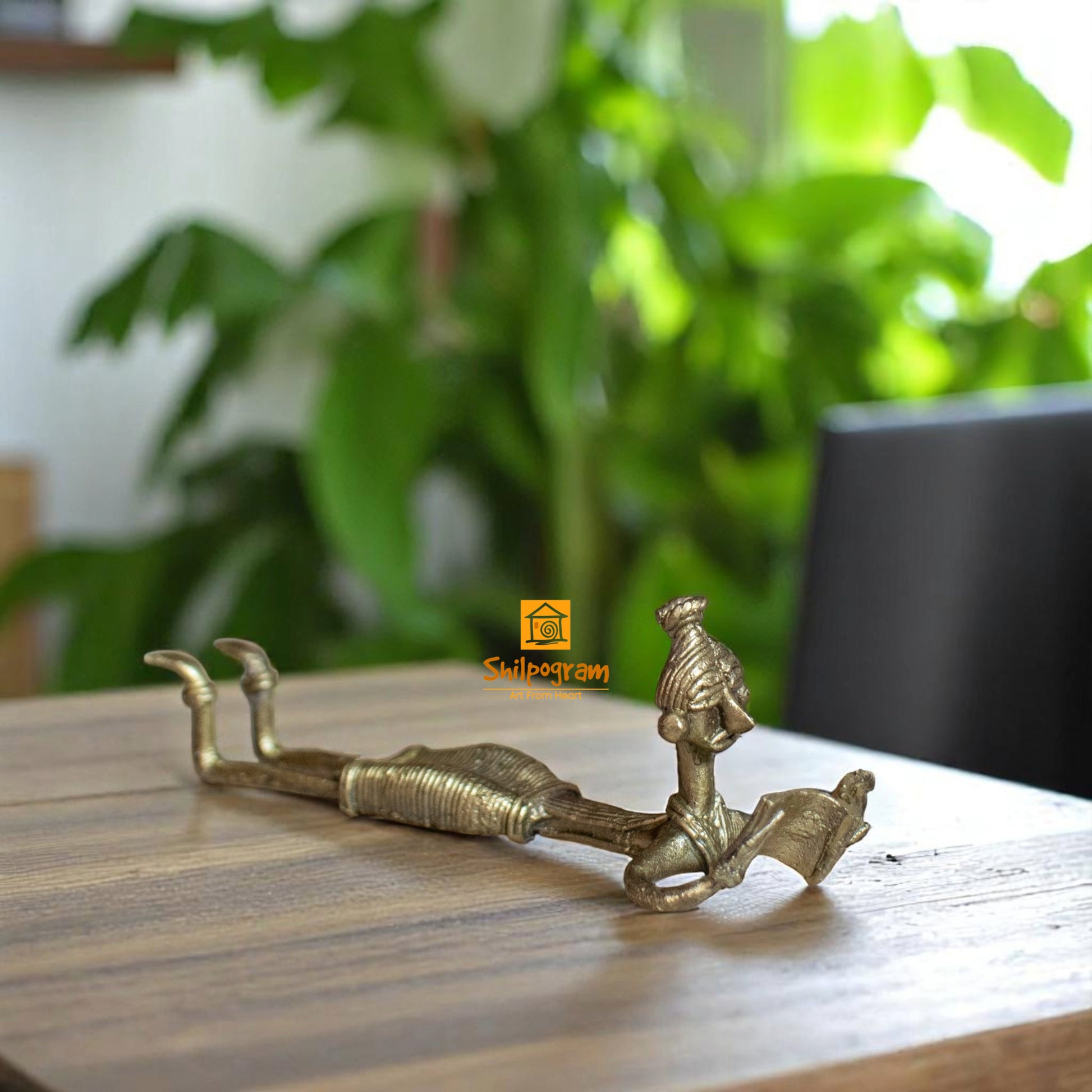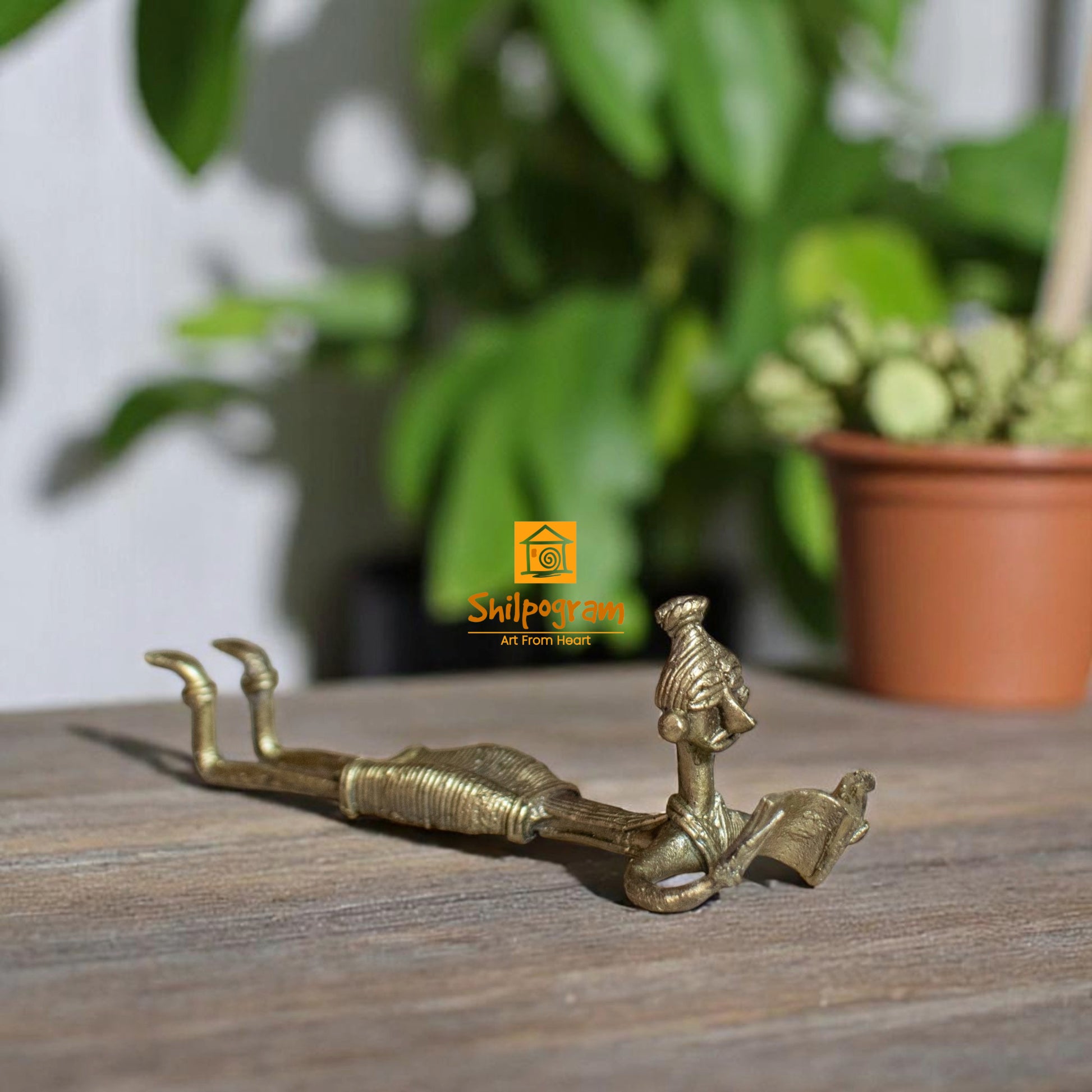 Elevate your home décor with this exquisite Dhokra Art Brass Metal showpiece featuring a woman reading a book. This handcrafted decorative piece showcases the ancient lost-wax casting technique, characterized by distinctive tribal motifs and intricate detailing. Each piece is uniquely crafted by skilled artisans, making it not just a decorative element but also a celebration of traditional Indian craftsmanship that adds cultural sophistication to any interior space.